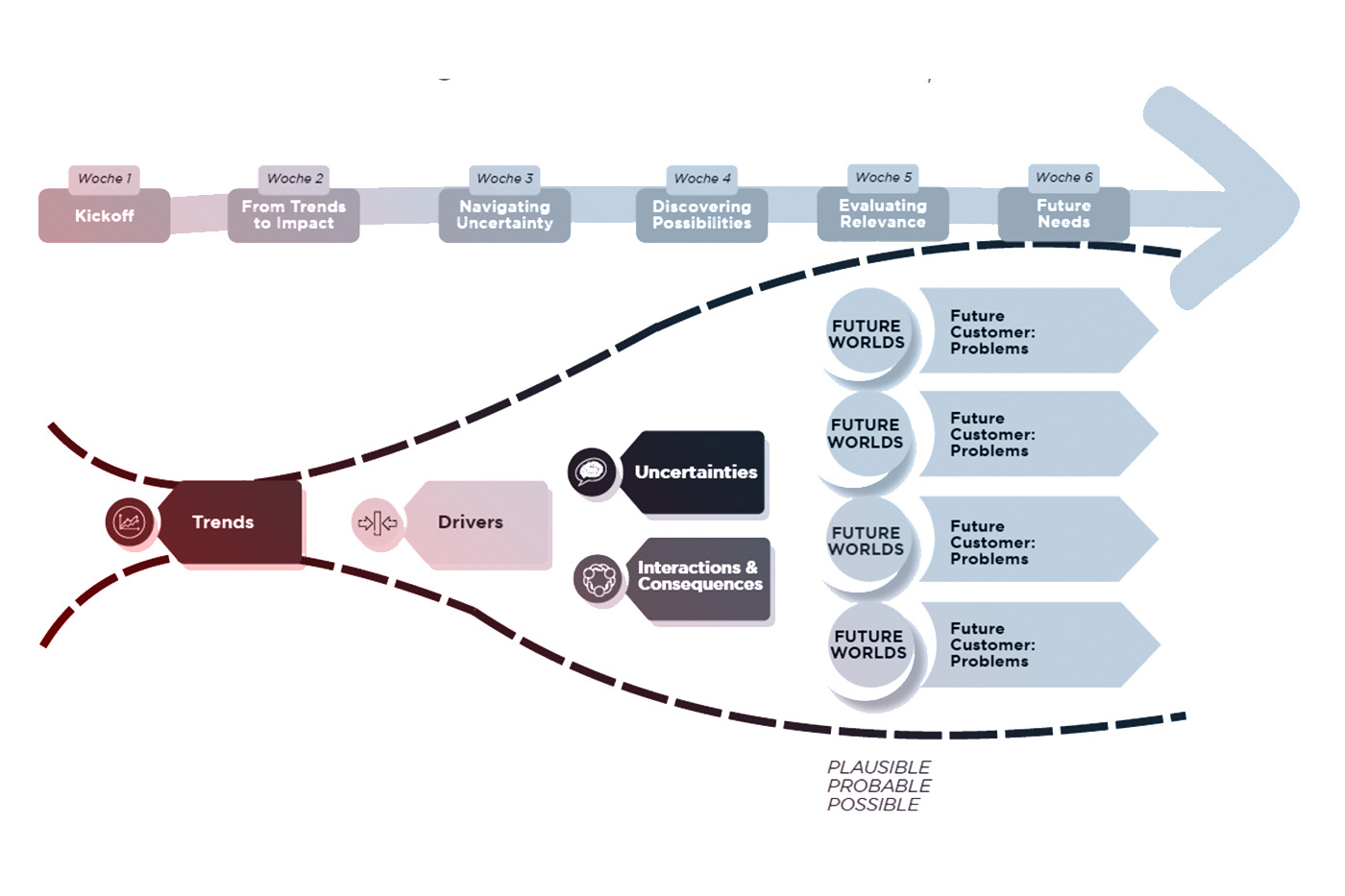 Die Polykrise zwingt Unternehmen, über heutige Geschäftsfelder hinauszudenken, wenn sie weiterhin wachsen wollen. Wo entstehen die Markt-Chancen der Zukunft? Wir begleiten mit Denk- und Planungsansätzen, die bewusst den Raum für neue globale Geschäftsmöglichkeiten öffnen. In unserem Futures Thinking Programm begleiten wir Vorstandsteams und Business Units dabei, diese Felder strukturiert zu entdecken.